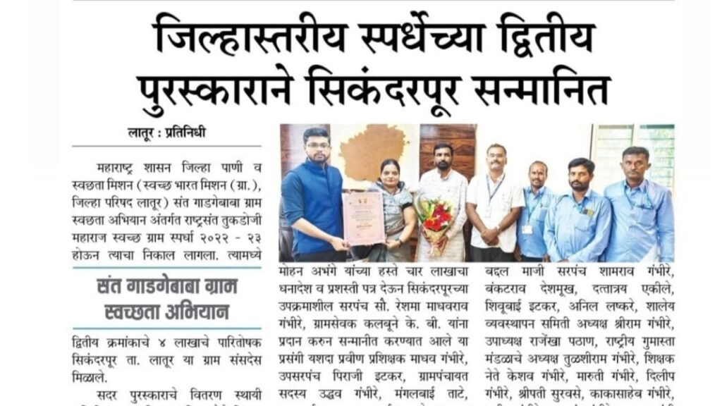 महाराष्ट्र शासनाच्या जिल्हा पाणी व स्वच्छता मिशन (स्वच्छ भारत मिशन–ग्रामीण) तसेच जिल्हा परिषद लातूर यांच्या संयुक्त विद्यमाने राबविण्यात आलेल्या संत गाडगेबाबा ग्राम स्वच्छता अभियान अंतर्गत आयोजित राष्ट्रसंत तुकडोजी महाराज स्वच्छ ग्राम स्पर्धा २०२२–२३ चा निकाल जाहीर झाला असून, या स्पर्धेत लातूर तालुक्यातील सिकंदरपूर ग्रामपंचायतीने जिल्हास्तरावर द्वितीय क्रमांक पटकावला आहे. या कामगिरीबद्दल गावाला ४ लाख रुपयांचे पारितोषिक प्रदान करण्यात आले.