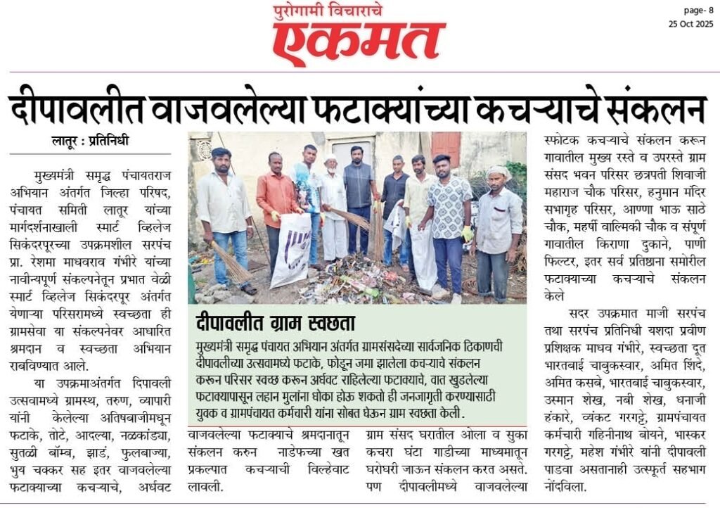 मुख्यमंत्री समृद्ध पंचायतराज अभियान अंतर्गत जिल्हा परिषद, पंचायत समिती लातूर यांच्या मार्गदर्शनाखाली स्मार्ट व्हिलेज सिकंदरपूरच्या उपक्रमशील सरपंच प्रा. रेशमा माधवराव गंभीरे यांच्या नावीन्यपूर्ण संकल्पनेतून प्रभात वेळी स्मार्ट व्हिलेज सिकंदरपूर अंतर्गत येणाऱ्या परिसरामध्ये स्वच्छता ही ग्रामसेवा या संकल्पनेवर आधारित श्रमदान व स्वच्छता अभियान राबविण्यात आले. या उपक्रमाअंतर्गत दिपावली उत्सवामध्ये ग्रामस्थ, तरुण, व्यापारी यांनी केलेल्या अतिषबाजीमधून फटाके, तोटे, आदल्या, नळकांड्या, सुतळी बॉम्ब, झाडं, फुलबाज्या, भुय चक्कर सह इतर वाजवलेल्या फटाक्याच्या कचऱ्याचे, अर्धवट दीपावलीत ग्राम स्वछता मुख्यमंत्री समृद्ध पंचायत अभियान अंतर्गत ग्रामसंसदेच्या सार्वजनिक ठिकाणची दीपावलीच्या उत्सवामध्ये फटाके, फोडून जमा झालेला कचऱ्याचे संकलन करून परिसर स्वच्छ करून अर्धवट राहिलेल्या फटाक्याचे, वात खुडलेल्या फटाक्यापासून लहान मुलांना धोका होऊ शकतो ही जनजागृती करण्यासाठी युवक व ग्रामपंचायत कर्मचारी यांना सोबत घेऊन ग्राम स्वछता केली. वाजवलेल्या फटाक्याचे श्रमदानातून संकलन करुन नाडेफच्या खत प्रकल्पात कचऱ्याची विल्हेवाट लावली. ग्राम संसद घरातील ओला व सुका कचरा घंटा गाडीच्या माध्यमातून घरोघरी जाऊन संकलन करत असते. पण दीपावलीमध्ये वाजवलेल्या स्फोटक कचऱ्याचे संकलन करून गावातील मुख्य रस्ते व उपरस्ते ग्राम संसद भवन परिसर छत्रपती शिवाजी महाराज चौक परिसर, हनुमान मंदिर सभागृह परिसर, आण्णा भाऊ साठे चौक, महर्षी वाल्मिकी चौक व संपूर्ण गावातील किराणा दुकाने, पाणी फिल्टर, इतर सर्व प्रतिष्ठाना समोरील फटाक्याच्या कचऱ्याचे संकलन केले सदर उपक्रमात माजी सरपंच तथा सरपंच प्रतिनिधी यशदा प्रवीण प्रशिक्षक माधव गंभीरे, स्वच्छता दूत भारतबाई चाबुकस्वार, अमित शिंदे, अमित कसबे, भारतबाई चाबुकस्वार, उस्मान शेख, नबी शेख, धनाजी हंकारे, व्यंकट गरगट्टे, ग्रामपंचायत कर्मचारी गहिनीनाथ बोयने, भास्कर गरगट्टे, महेश गंभीरे यांनी दीपावली पाडवा असतानाही उत्स्फूर्त सहभाग नोंदविला.