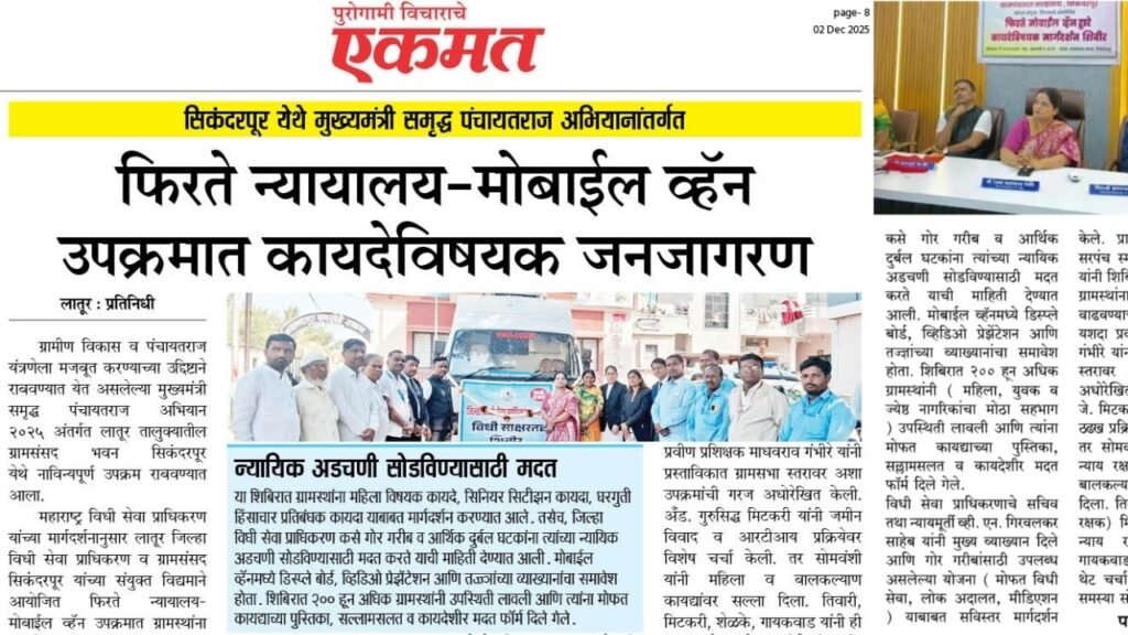 महाराष्ट्र विधी सेवा प्राधिकरण यांच्या मार्गदर्शनानुसार लातूर जिल्हा विधी सेवा प्राधिकरण (DLSA) व ग्रामसंसद सिकंदरपूर यांच्या संयुक्त विद्यमाने आयोजित ” फिरते न्यायालय – मोबाईल व्हॅन ” उपक्रमात ग्रामस्थांना कायदेविषयक माहिती व जनजागरण कार्यक्रम आयोजित करण्यात आला. या उपक्रमामुळे दुर्गम भागातील गावकऱ्यांना न्यायिक सेवा सहज उपलब्ध होईल आणि अभियानाचे उद्दिष्ट साध्य होईल, असे आयोजकांनी सांगितले.